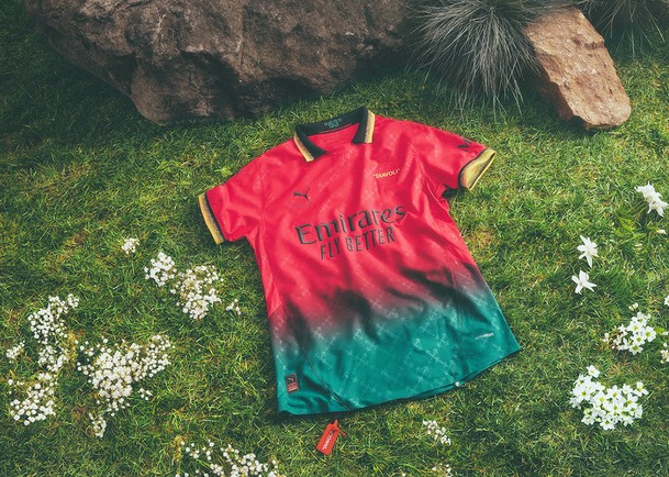 从外观上看,这款联名球衣提供了两种不同的配色方案。一款以黑色为基调,衬衫下部渐变为力量绿色,搭配着炽黄色的标志和红色细节装饰。另一款则以红色为基调,同样呈现出渐变的力量绿色,而米兰队徽则是单色的。这种设计不仅突显了球衣的时尚感,同时也展现了对黑人历史和文化的尊重。